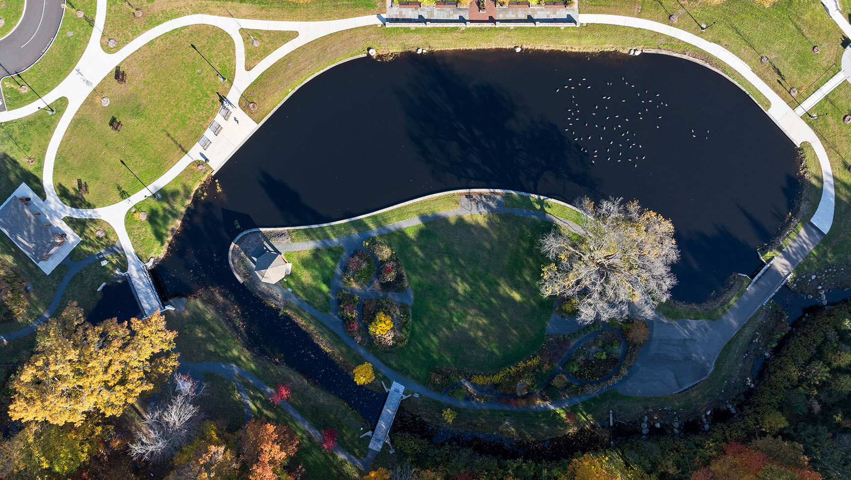 The park design features a natural playground, educational nature trails, ice skating, fishing, an outdoor fireplace, and a picnic pavilion. The park’s unique island was transformed into a one-of-a-kind arboretum and event space, which can be used for gatherings, weddings, and educational enjoyment of native plant material.