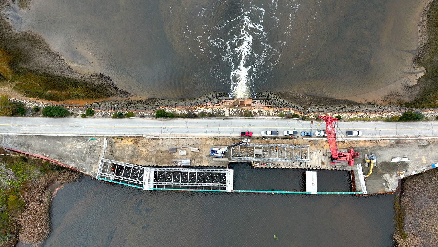 These operable gates allow for controlled flow. Over a long period of time, this will re-establish the aquatic and vegetation environments that existed at this site prior to the roadway’s construction. Additionally, this bridge structure will provide future flood protection for homes and infrastructure around the restored marsh area.